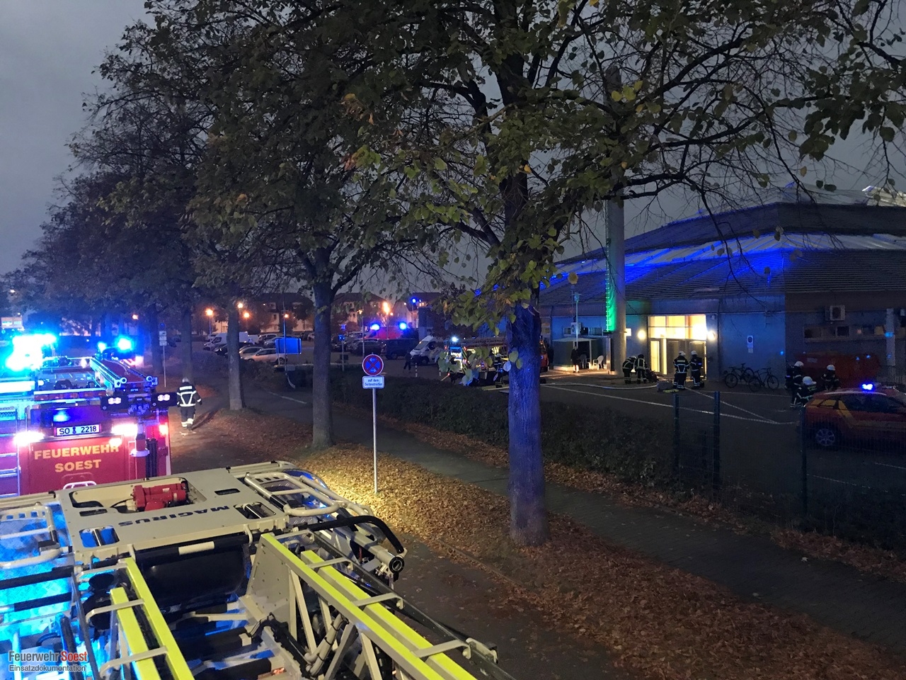 In einem Spaßbad kam es zu einem Kleinbrand im Keller. Durch die entstandene Rauchentwicklung wurde die Brandmeldeanlage ausgelöst und das Bad wurde evakuiert. Durch die ersten eingetroffenen Kräfte wurde direkt ein Trupp unter schwerem Atemschutz zur Brandbekämpfung eingesetzt. Aufgrund der herbstlichen Temperaturen wurden an alle Badegäste Rettungsdecken zum Wärmeerhalt ausgegeben. Die Gäste wurden anschließend in das Foyer des Bades verbracht und dort durch den Rettungsdienst und der Feuerwehr betreut. Das Feuer konnte relativ schnell gelöscht werden, allerdings gestaltete sich die Entrauchung des Kellers etwas zeit intensiv.