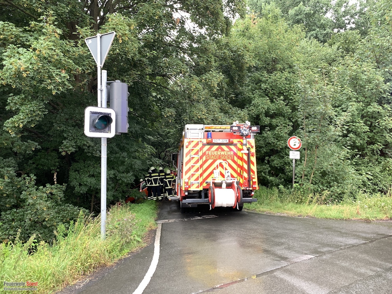 Ein Pkw war in einen Graben gerutscht. Das Fahrzeug wurde von uns gegen weiteres Abrutschen oder Umkippen gesichert. Anschließen konnten die Personen den PKW unverletzt verlassen.