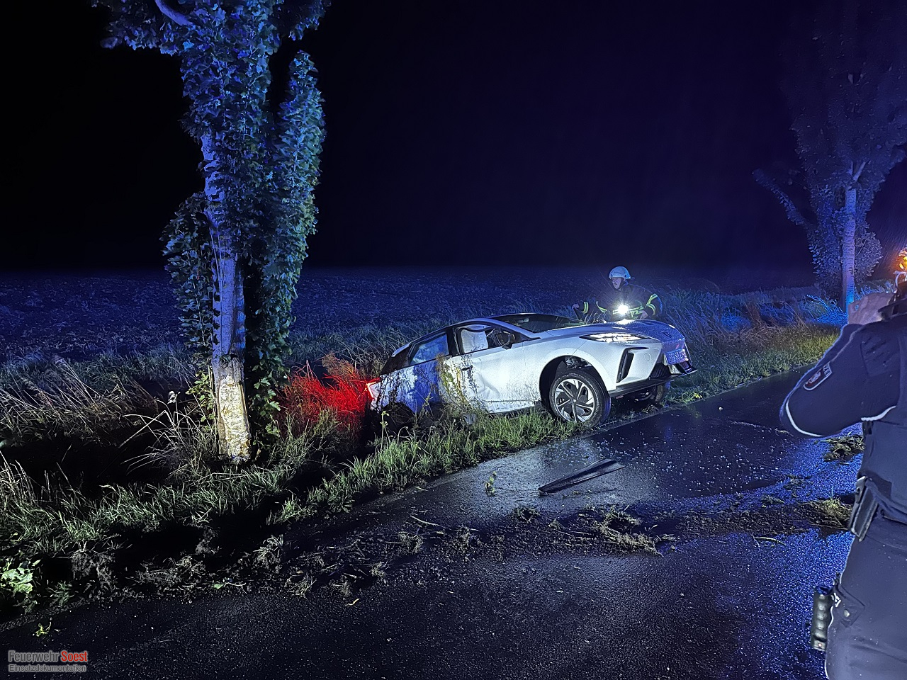 Bei einem Alleinunfall war ein Pkw gegen einen Baum gefahren und ist anschließend im Graben gelandet. Der Fahrer konnte glücklicherweise das Fahrzeug selbstständig verlassen und wurde vom Rettungsdienst untersucht. Unsere Maßnahmen beschränkten sich auf das Deaktivieren des Pkw, da es sich um ein Elektrofahrzeug handelte.